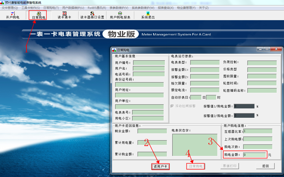 重新插張新卡到讀卡器,以上信息都根據(jù)自己要求設(shè)置好之后,單擊“開戶購(gòu)電”。出現(xiàn)以下畫面。