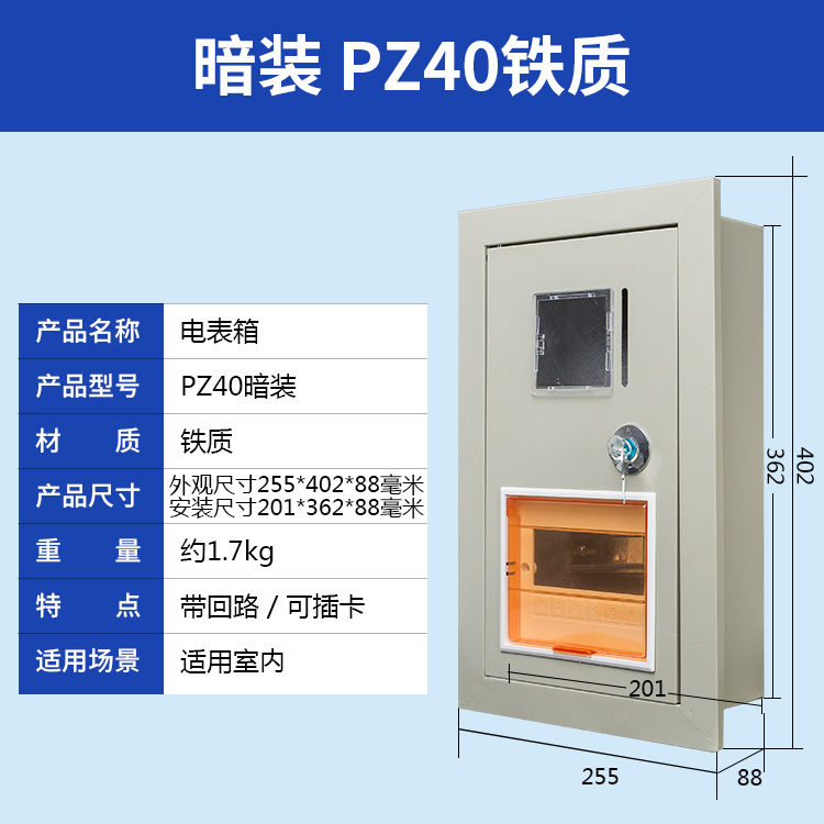 我公司生產的PZ40電表箱采用0.5-1mm厚冷軋鋼板和進口PC高透視窗,并帶有門鎖,安全防盜,大氣美觀。可安裝各類電能表和C45、空氣開關、斷路器閘刀等,廣泛用于家庭、公寓、學校、工廠等場所。